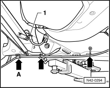 - Unclip parking brake cable from bracket at rear axle body - arrow A - and disengage from brackets - arrows -.