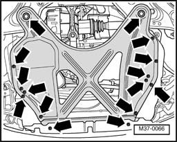CAUTION! Only remove engine support bridge 10 - 222 A when bolts for left and right subframe mounts are tightened to tightening torque.