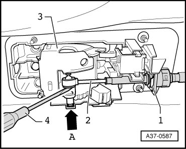 - Guide selector lever cable - 2 - into selector mechanism housing and press onto selector lever - 3 - using a screwdriver - 4 -.