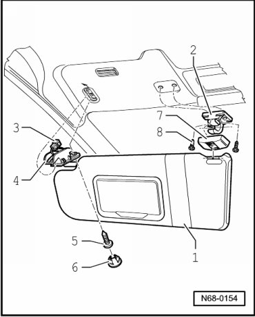 - Unhook sun visor - 1 - out of mount - 2 -.