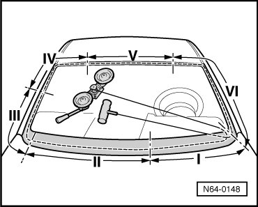 - Push cutting cord end through adhesive sealant into vehicle interior using awl (from (V.A.G 1474 A )).