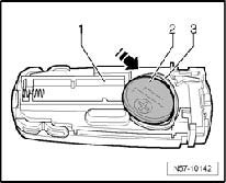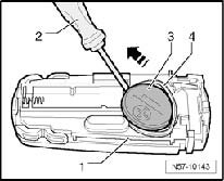 - Guide battery - 2 -, with plus pole facing up, at an angle - arrow - into retainer - 3 - of remote control key - 1 - (plus pole is marked in housing).