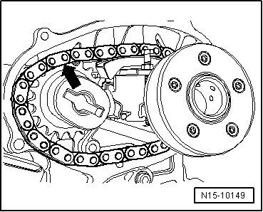 - Place the chain in this position onto the chain sprocket of the intake camshaft, first at the top - arrow -.