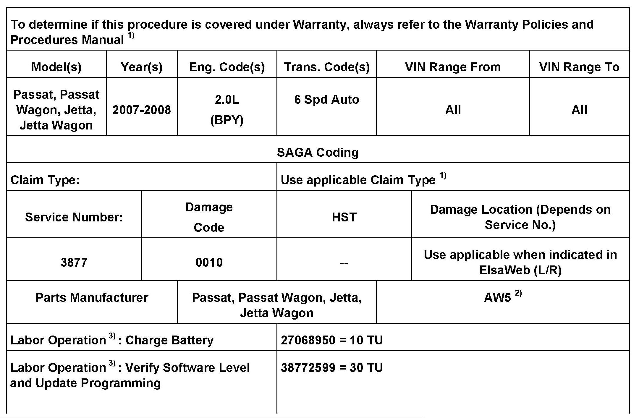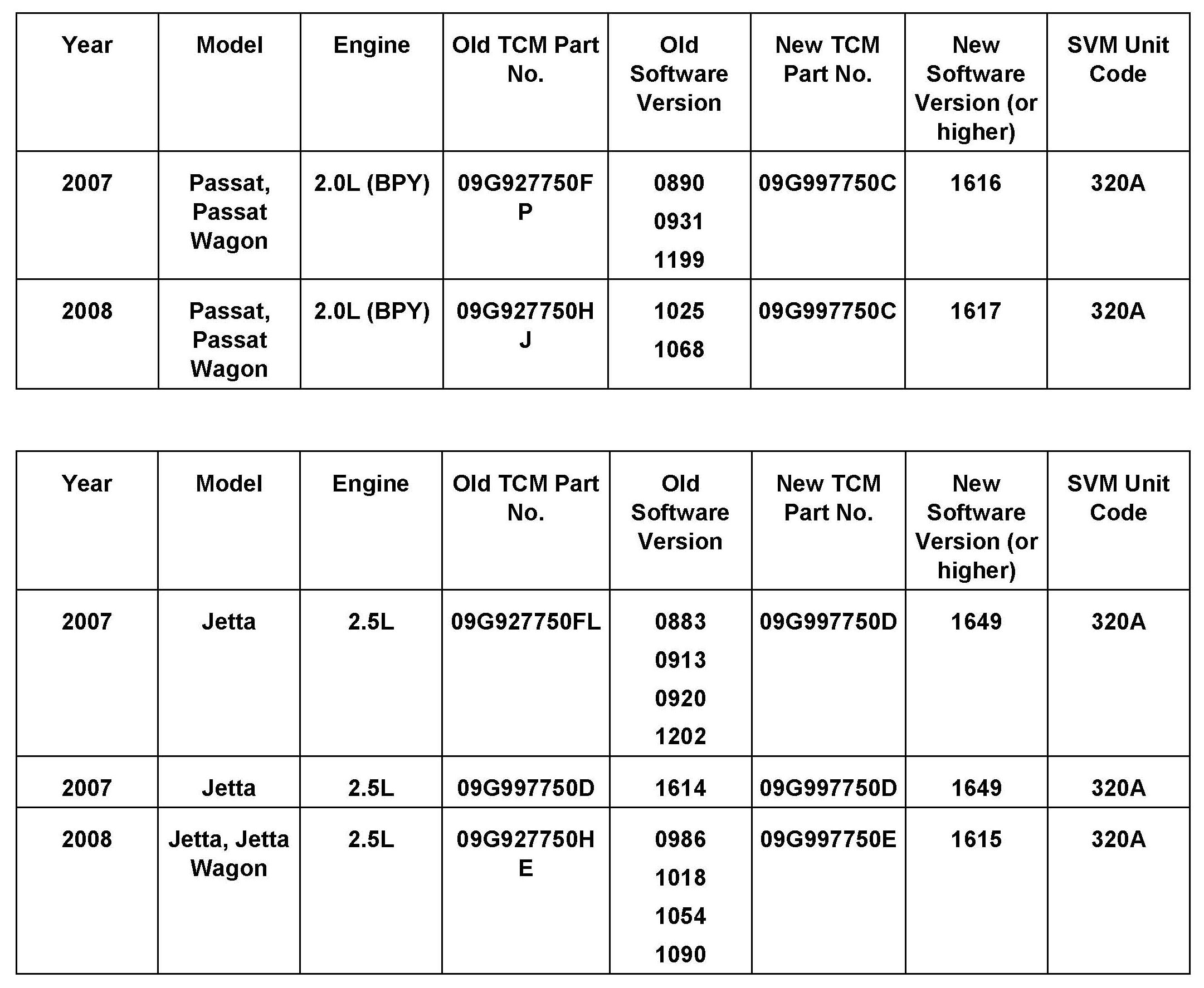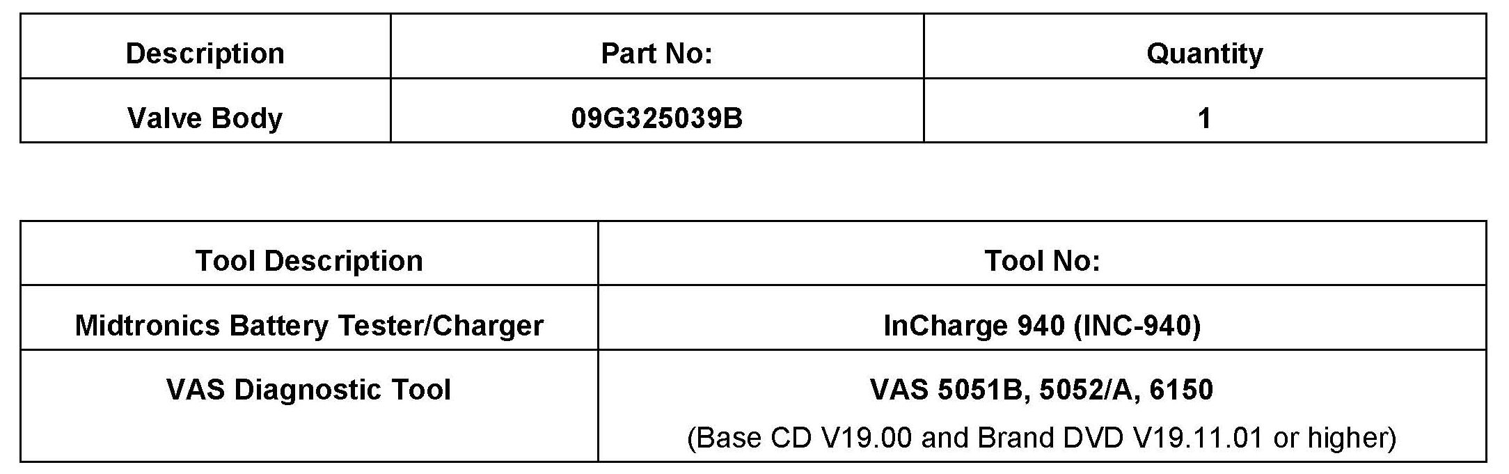 ^ Install updated transmission valve body Part No. 09G325039B, See Repair Manual Group 38 AUTOMATIC TRANSMISSION, 6spd. Automatic Transmission.