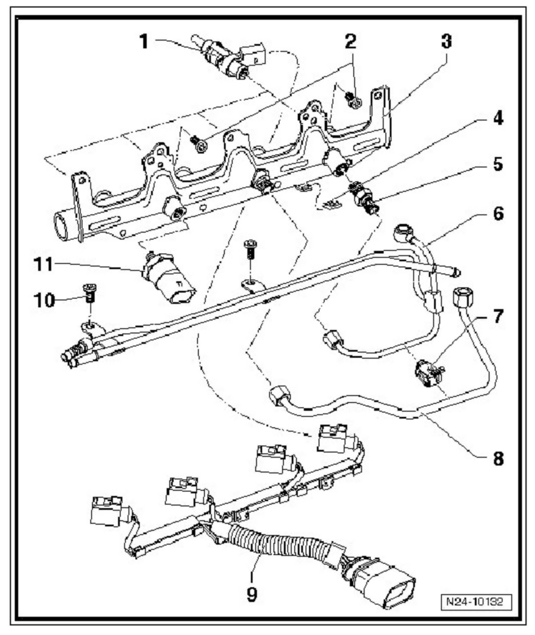 When changing a 2.0T FSI engine (BPY engine code), verify that the part number of high pressure sensor -G247- (# 11) installed on fuel rail matches part number on engine that was removed.