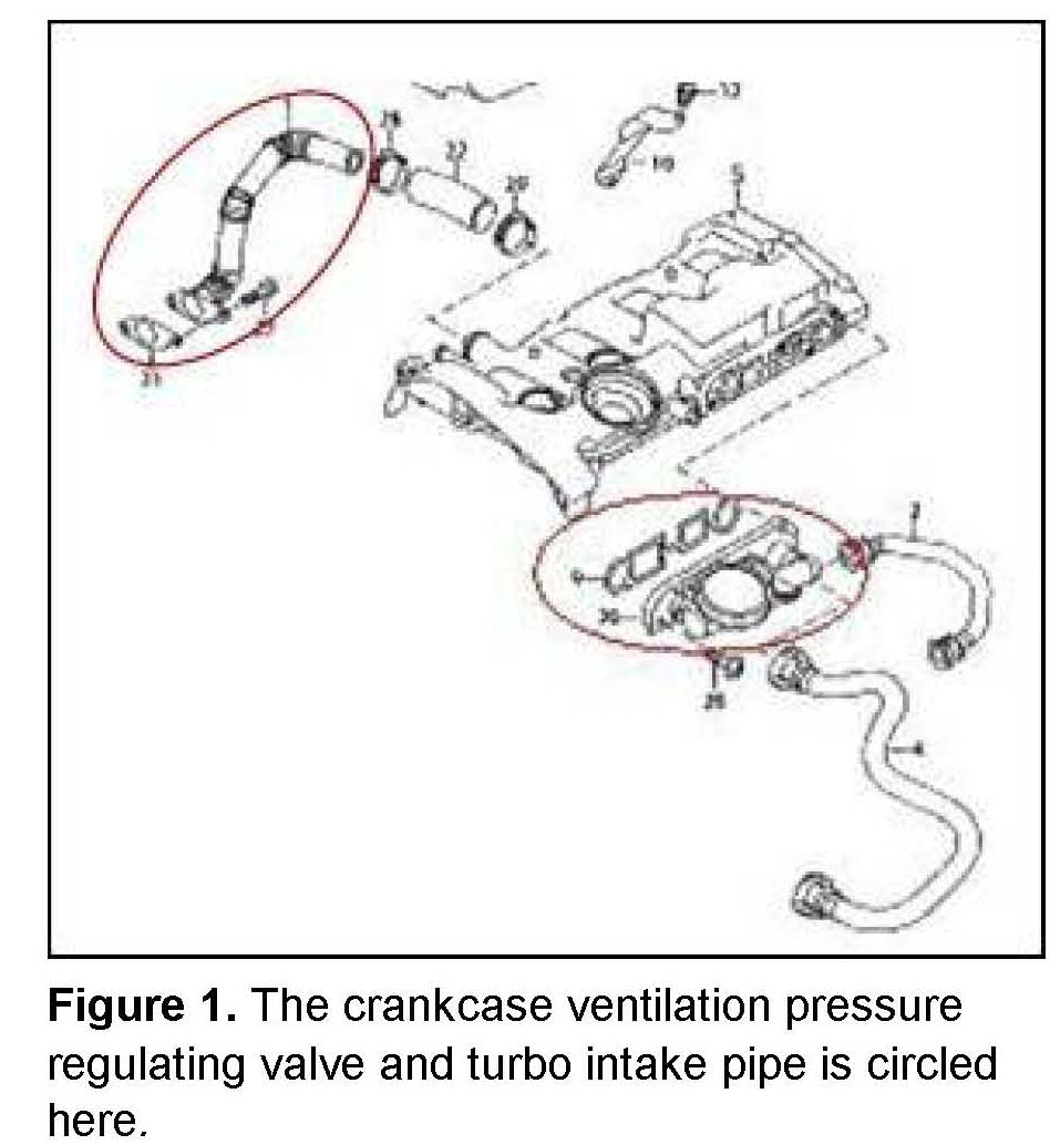 The conditions described may be caused by a malfunction of the crankcase ventilation pressure regulating valve or turbocharger intake pipe (Figure 1), resulting in excessive vacuum or excessive pressure being applied to the engine crankcase.
