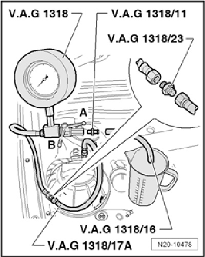 - Connect pressure gauge V.A.G 1318 with double connection V.A.G 1318/23 and adapter set V.A.G 1318/17A to fuel supply line.
