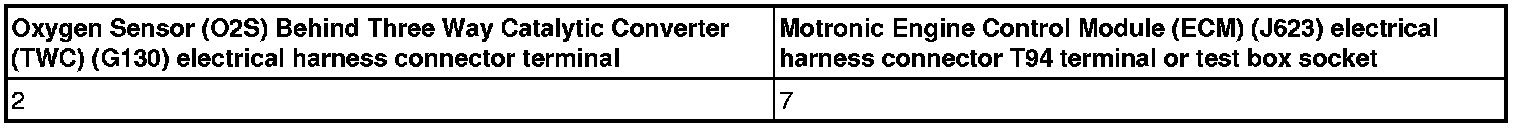 - Using a multimeter, check the Oxygen Sensor (O2S) Behind Three Way Catalytic Converter (TWC) (G130) electrical harness connector terminal 2 to the Motronic Engine Control Module (ECM) (J623) electrical harness connector T94 terminal 7 for an open circuit.