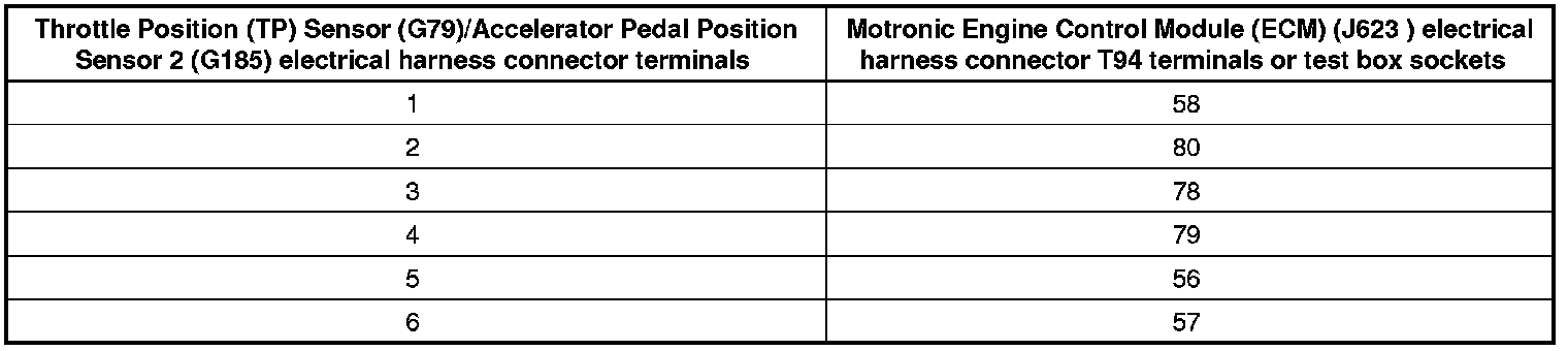 - Using a Multimeter, check the Throttle Position (TP) Sensor (G79)/Accelerator Pedal Position Sensor 2 (G185) electrical harness connector terminals to the Motronic Engine Control Module (ECM) (J623) electrical connector T94 for an open circuit.