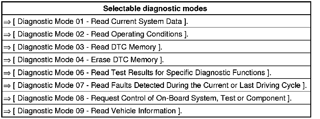 The information provided in Modes 01 through 09 displays the various levels of emission related data that may be monitored, as well as the ability to retrieve and read stored DTC trouble codes, erase stored DTC trouble codes, generate readiness codes, and select the various PIDs and Test-IDs used within the modes to monitor the engine, and emission related component parameters.