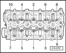 - Tighten cylinder head cover bolts in several stages in designated sequence to 10 Nm.