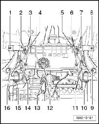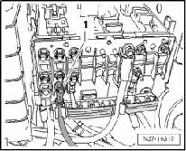 - Loosen bolts - 4 and 5 - and lower subframe with brackets slightly. Observe electrical wires, when doing so.