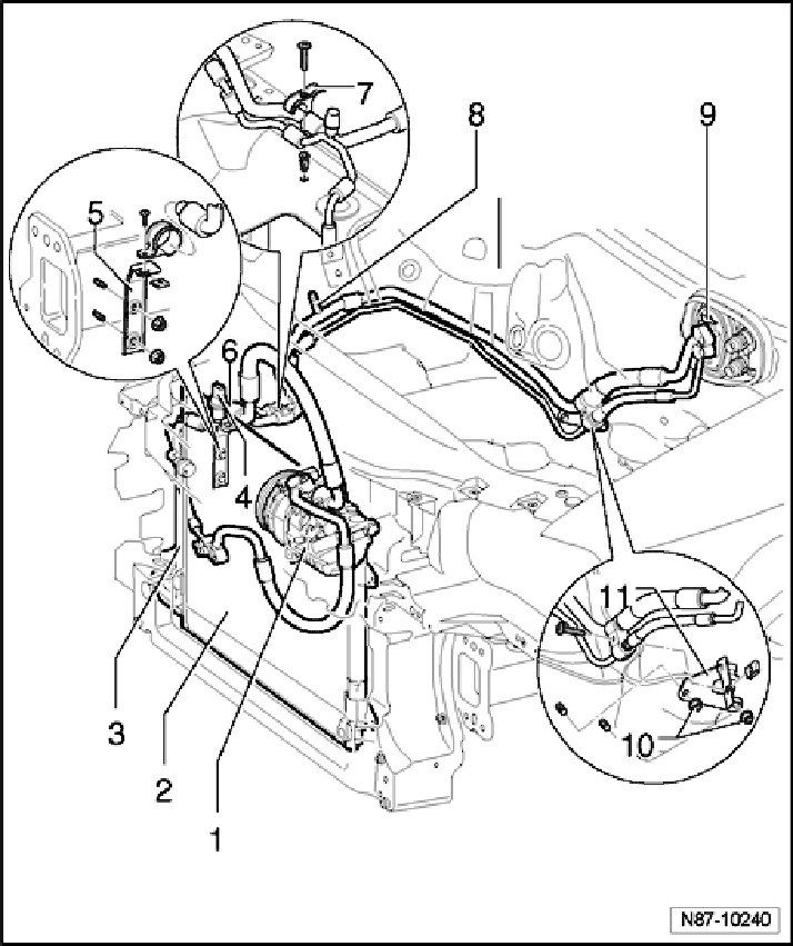 - The fluid reservoir with dryer cartridge is mounted on the right or left side on the condenser depending on the engine type.