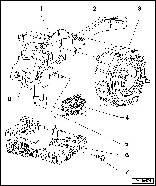 • Removing and installing, refer to => [ Airbag Spiral Spring/Return Spring With Slip Ring, Through 10.09 ] Steering Column Switch.