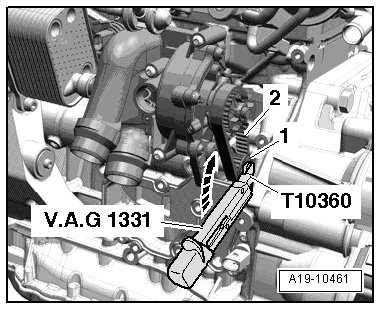 - Remove the bolt on the coolant pump drive gear - 1 - using Torque Wrench (V.A.G 1331) clockwise and Insert Tool (T10360); at the same time, counterhold the vibration damper.