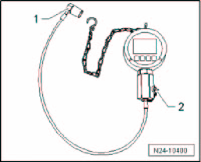 - Remove locking bolt - 2 - and install the fuel pressure sensor in the pressure sensor tester VAS 6394/1. Tighten to 22 Nm.