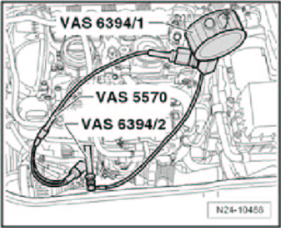 - Connect pressure sensor tester VAS 6394/1 pressure line to adapter VAS 6394/2.