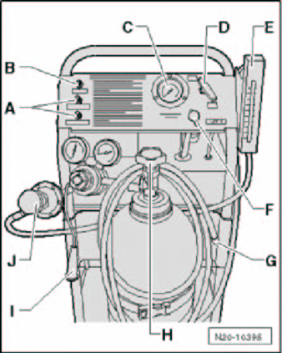 - Observe pressure gauge - C - and flow meter - E -. The fuel system is filled if the flow quantity decreases and the pressure increases to 10 in. H2O (25 mbar).