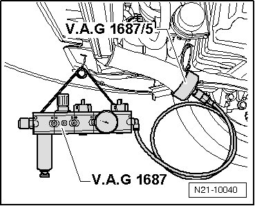 • Before removing adapter, discharge pressure in testing circuit by pulling off coupling from adapter (V.A.G 1687/5).