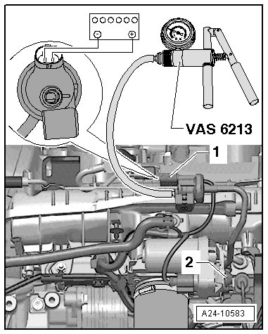 - Using the lines, connect the contacts on the EVAP canister purge regulator valve (N80) - 1 - to the battery. This opens the EVAP canister purge regulator valve (N80).