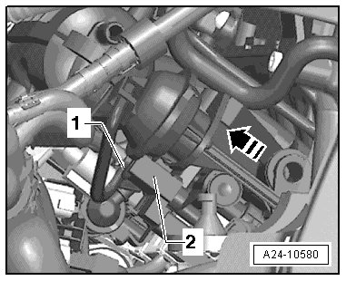 - Remove the vacuum hose - 1 - on the intake manifold runner control valve (N316) - 2 - to the control valve actuator.