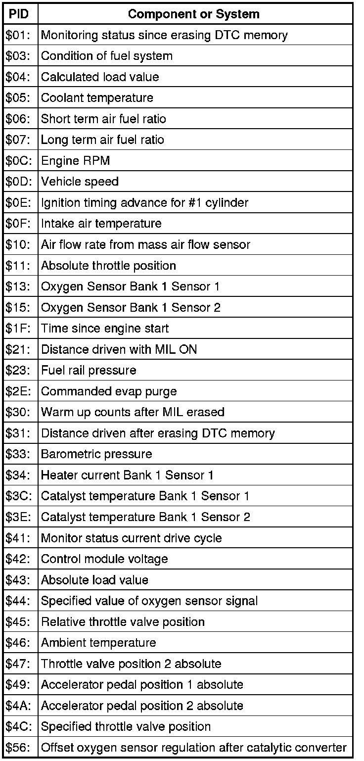 • Depending on scan tool and protocol used, the information in diagnostic mode 01 may be referred to by different names such as Test-ID (TID), Hex-ID, Component-ID (CID), or On-Board Diagnostic Monitor Identifier (OBDMID).