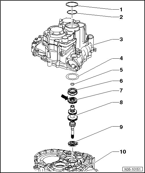• Removing and installing, refer to => [ Transmission, Without Cap/Input Shaft Circlip ] Transmission, Without Cap/Input Shaft Circlip.