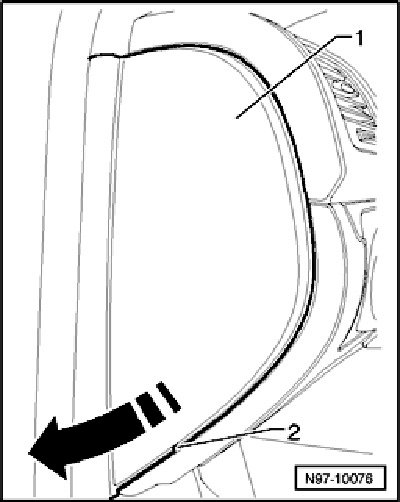 - Remove side cover - 1 - of instrument panel, do this by inserting trim removal wedge 3409 or a screwdriver into recess - 2 - and pry off cover - 1 - in - direction of arrow -.