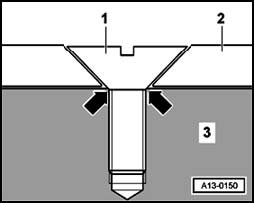 ^ Sensor wheel may only be installed once, since attachment points - arrows - of countersunk screws - 1 - in sensor wheel - 2 - are so severely deformed after mounting the second time that bolt heads make contact on the crankshaft - 3 - and sensor wheel lies loosely under the bolt heads.