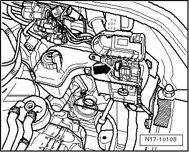 - Connect the (V.A.G 1527B) to the battery positive terminal (connection in engine compartment - arrow -) and the oil pressure switch using adapter cables from (V.A.G 1594C). Light Emitting Diode (LED) must not light up.