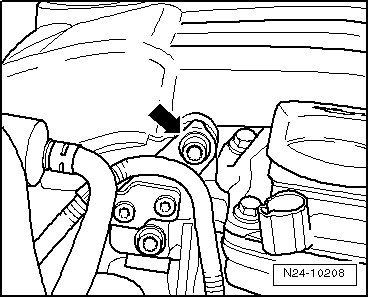 - Remove the transmission fluid line bolt - arrow - from the transmission. Catch any leaking transmission fluid.
