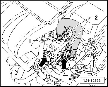 - Disconnect the connectors - arrows - and remove the low pressure hose - 1 - and high pressure line - 2 -. When doing this, counter hold the connection on the high pressure pump using a wrench.