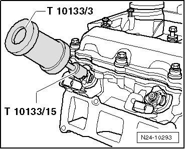 - Rotate the engine at the vibration damper slowly in engine rotation direction. When doing this, press the plunger in the - direction of the arrow - until it reaches the deepest point in the cylinder head.
