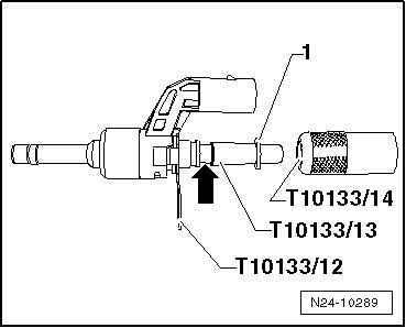 - Slide the support washer - 1 - using (T10133/14) (the knurled side faces toward the fuel injector) onto the fuel injector up to the first groove - arrow -.