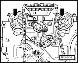 ^ If the intake camshaft adjuster is attached to the camshaft, the adjuster must be rotated left accordingly with the chain sprocket and then the camshaft timing chain must be routed.