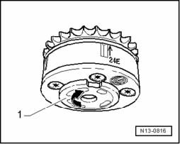 - Turn the sensor wheel - 1 - on the intake camshaft adjuster clockwise - in direction of arrow - until it stops and hold the adjuster in this position.