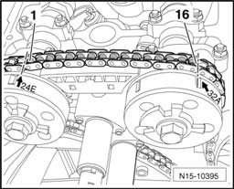 - Now insert exhaust camshaft adjuster "32A" positioned with the tooth at arrow marking into camshaft timing chain so that the exact, previously counted 16 rollers lie between markings "24E" and "32A".