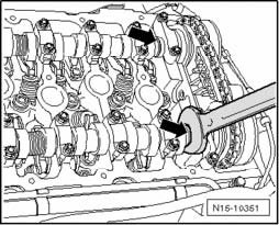 - Secure the respective camshaft to be tightened using an open end wrench (27 mm) - arrow -.