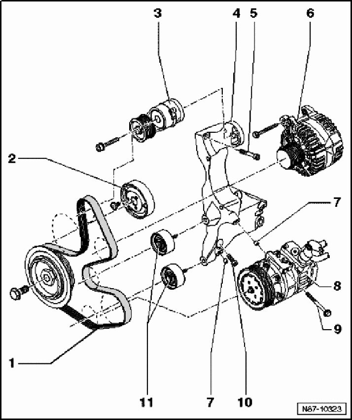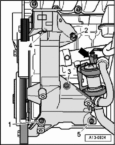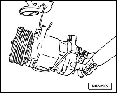 - Loosen A/C compressor, unscrew hex-bolts - 9 -. Remove A/C compressor from auxiliary component bracket and secure to body with appropriate material (e.g. welding wire)