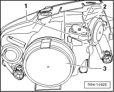 - Remove mounting bolt - 2 - and remove housing - 1 - completely.