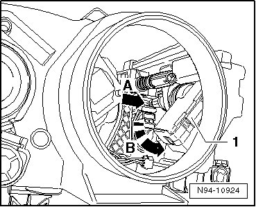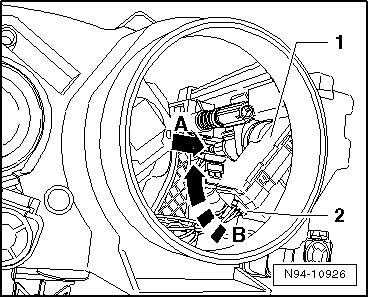 - Disengage headlamp beam adjustment motor - 1 - by rotating in - direction of arrow B -.