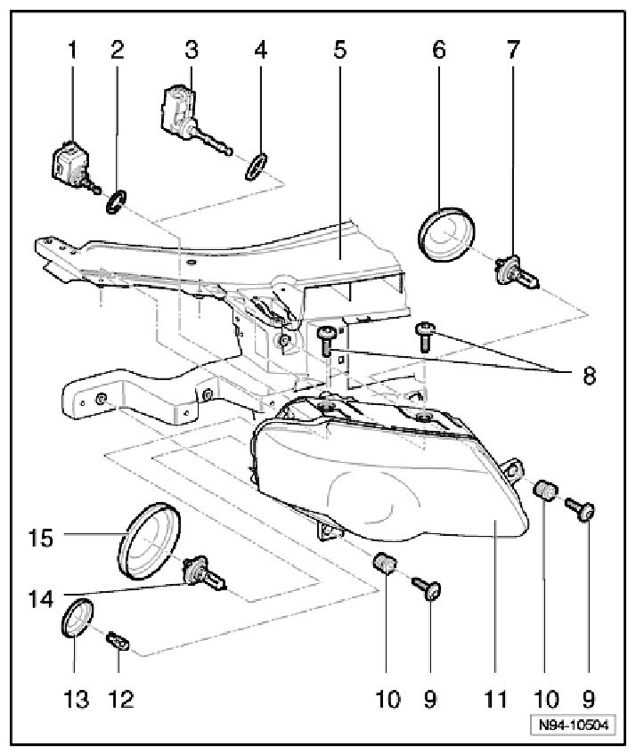 NOTE: In the exploded view illustration, the adjusting motors of the two headlamp manufacturers are depicted, since the removal and installation of them differ.
