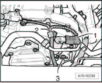 - Disconnect Camshaft Adjustment Valve 1 N205 electrical harness connector - 1 - or Camshaft Adjustment Valve 1 (exhaust) N318.