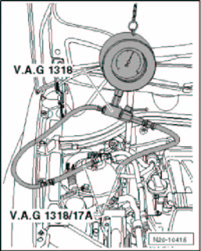 - Install the fuel injector pressure gauge V.A.G 1318 with the adapter set V.A.G 1318/17A.