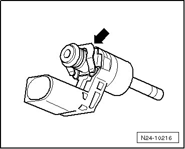 • If the fuel rail is removed, the fuel injector spring - arrow - must be replaced.