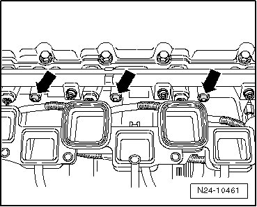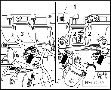 - Remove the fuel rail bolts - arrows - for cylinders 2, 4 and 6.