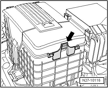 - Open locking mechanism - arrow - and remove the cover on the battery case.