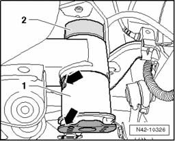 - Install bonded rubber bushing - 1 - into subframe, so that the tab and plate - arrows - face perpendicular to direction of travel.