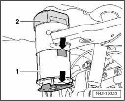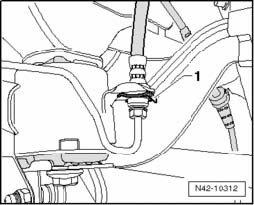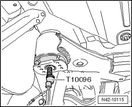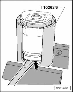 - Pry a screwdriver between tube T10356/6 and rubber bonded bushing - arrow - and, if necessary, remove bushing by tapping lightly with a hammer on the drift.