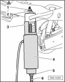 - Place engine/transmission jack V.A.G. 1383 A with universal transmission support V.A.G. 1359/2 below subframe and secure with strap.